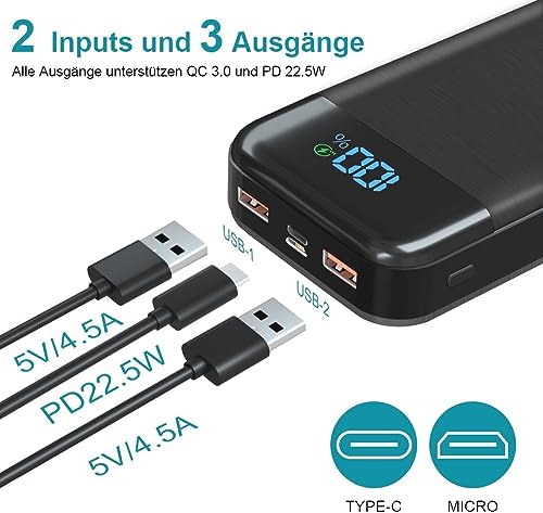 ✅【3 Output Ports】Simultaneous charging of multiple devicesThe portable power bank has 2 x 22.5W USB-A outputs and 1x 20W TYPE-C output, it can charge 3 devices simultaneously, which is very convenient for you and your friends.